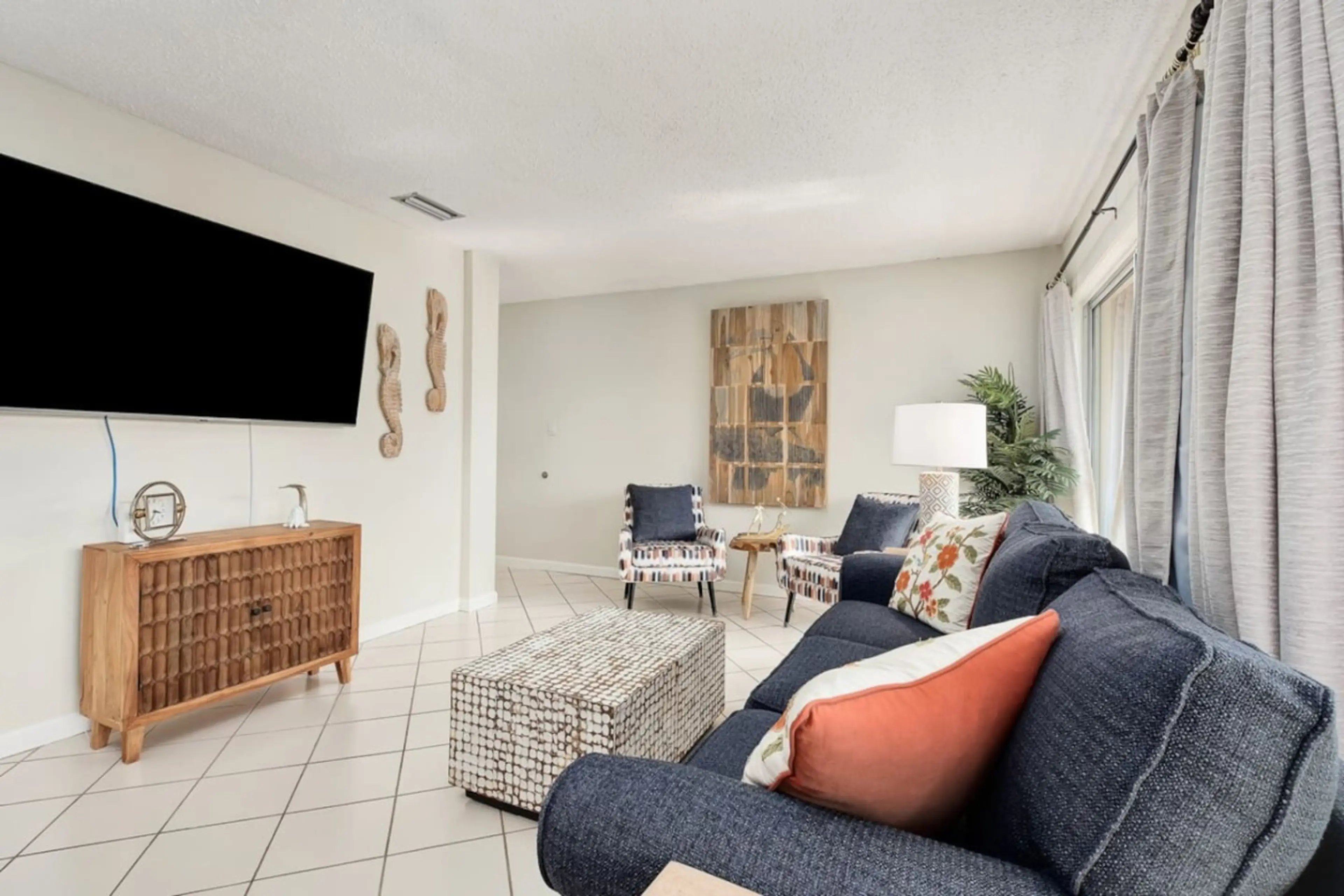 - 4 min drive to June Decker public beach access - King bedroom - queen pull-out sleeper sofa - tennis courts - 3 different pool - stocked kitchen Several pools (3) Tennis courts Pickel ball courts Grills Picnic tables Gazebos Feed the turtles Fishing is allowed with a state license Boat and ...